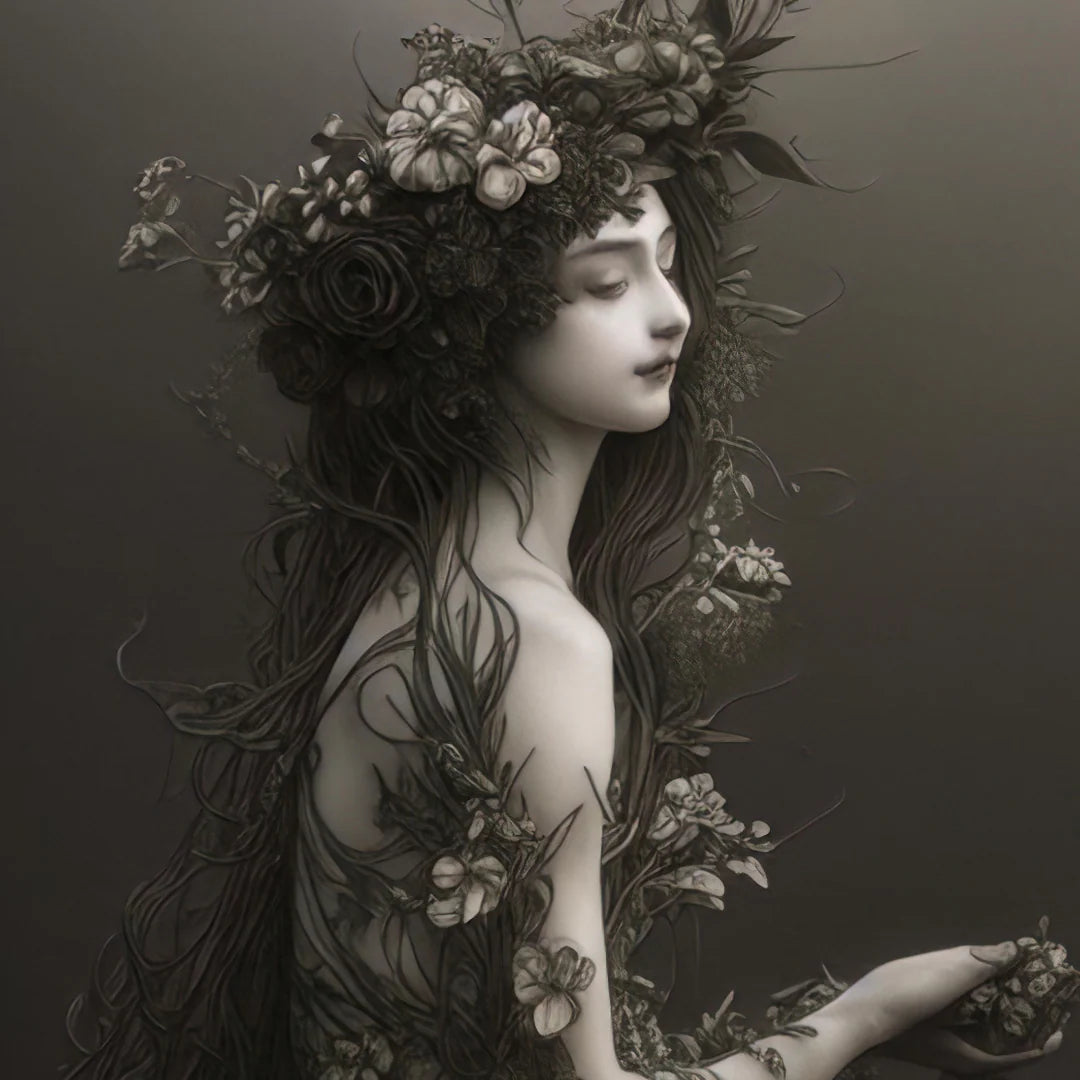 Moody, ethereal, and quietly captivating, Siren features a delicate feminine figure adorned with flowing botanicals and shadowy florals, rendered in a soft monochromatic palette. The interplay of light and shadow creates a sense of depth and mystery, while the intricate detailing of vines and blossoms adds an organic, almost dreamlike quality. This design evokes a haunting beauty that feels both elegant and timeless.